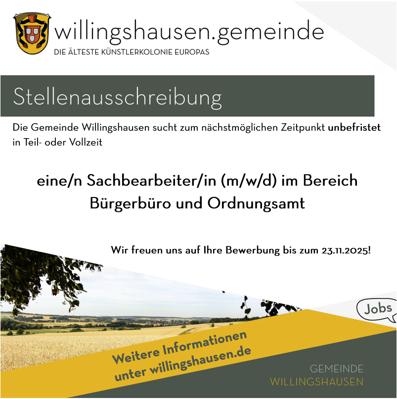 Die Gemeinde Willingshausen sucht zum nächstmöglichen Zeitpunkt unbefristet in Teil- oder Vollzeit eine/n Sachbearbeiter/in (m/w/d) im Bereich Bürgerbüro und Ordnungsamt.